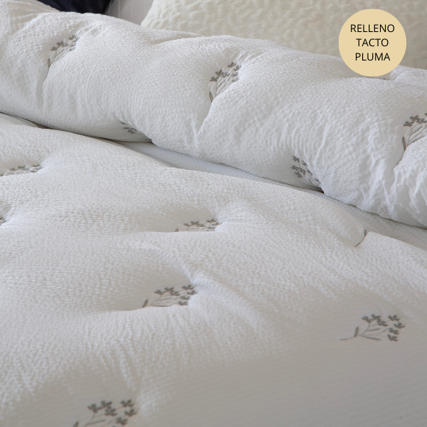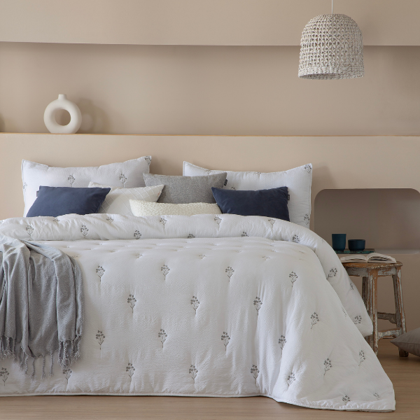 Colcha bouti comforter de entretiempo de la marca Fundeco by Antilo modelo Nadine con flores en color gris.Esta elegante Bouti bordada con tejido fantasía aporta un aire sofisticado y acogedor al dormitorio. Con un diseño en tono blanco, realzado por delicados bordados florales en tonos suaves, combina a la perfección la sencillez con el detalle artesanal. Su relleno tacto pluma lo convierte en ligero y acolchado siendo la opción ideal para vestir la cama con estilo, frescura y un toque de distinción.