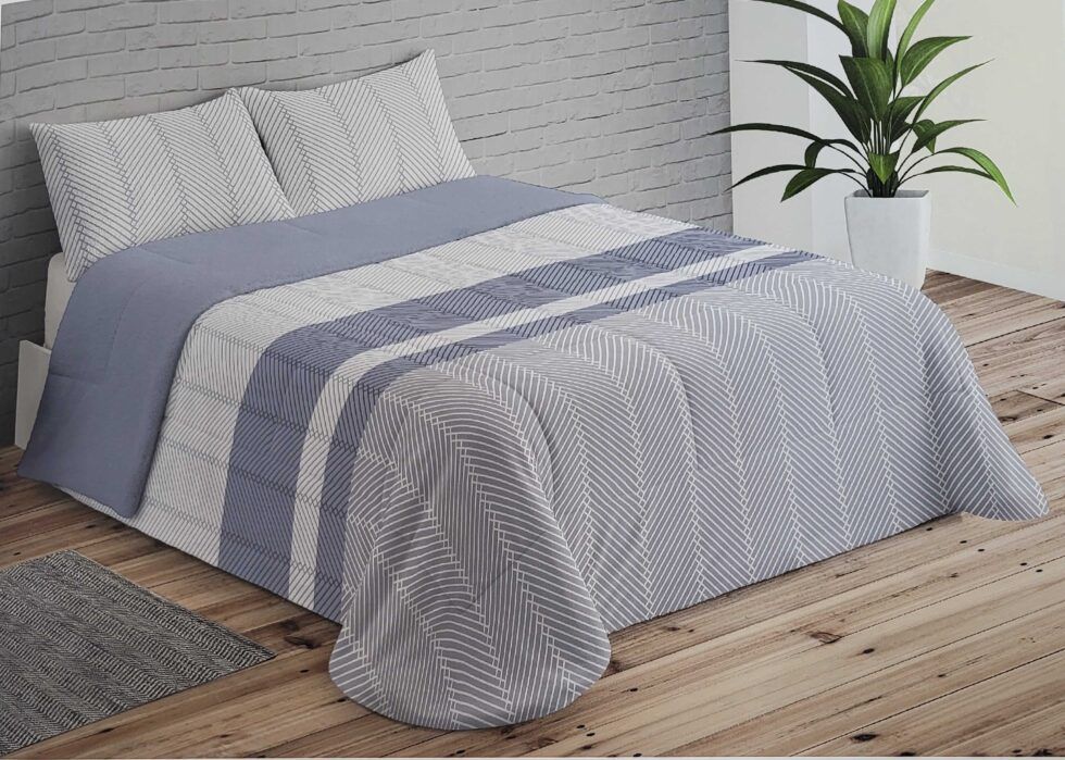 Edredón Sherpa modelo Fractal de Trovador. Tacto ultra suave, con exterior de nacarina e interior de borreguito. Una prenda cálida y muy confortable para el invierno. Cuenta con un diseño moderno en tonos azules y grises.