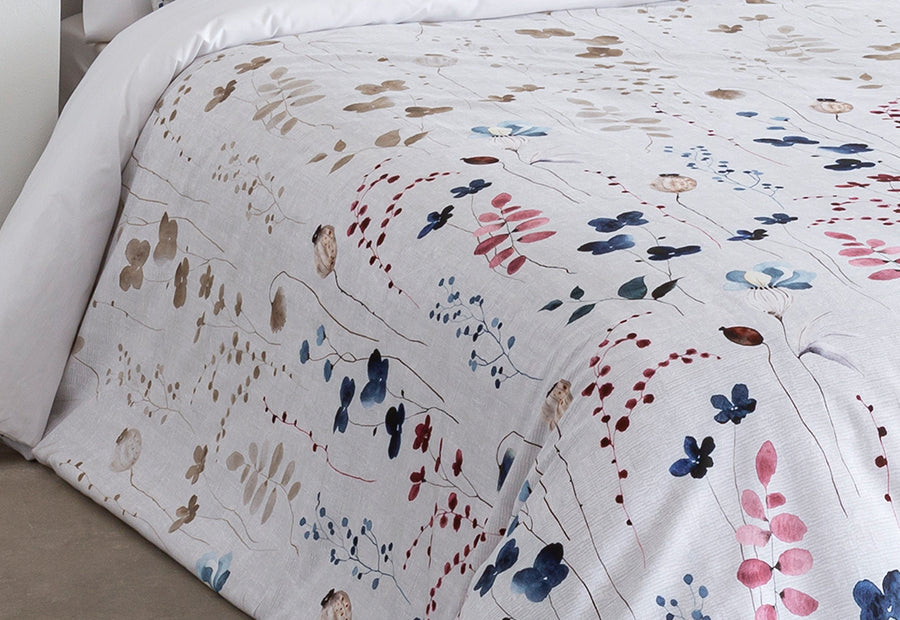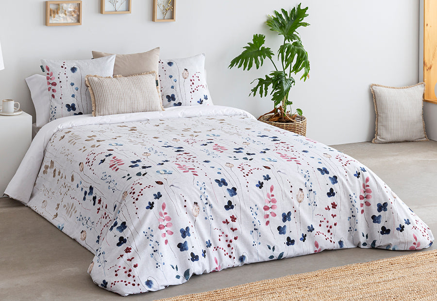 Su moderno estampado digital con dibujos de ramilletes de hojas y flores, en una variedad de colores que se combinan de manera exquisita sobre un fondo blanco., con una combinación de colores vibrantes, aporta un toque actual y decorativo que convierte cualquier dormitorio en un espacio acogedor y lleno de personalidad. Gracias a su abertura oculta, la funda nórdica permite colocar fácilmente el relleno nórdico y elegir el gramaje más adecuado según la estación.