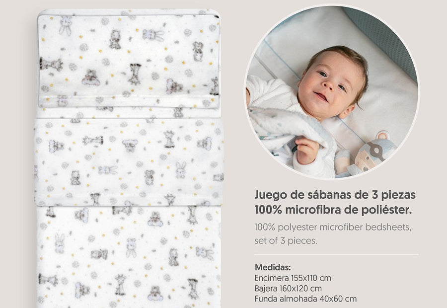 Tamaño Cuna 3 piezas: Bajera 60x120 cm, Encimera 100x160 cm y Almohada 30x60 cm.