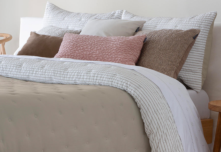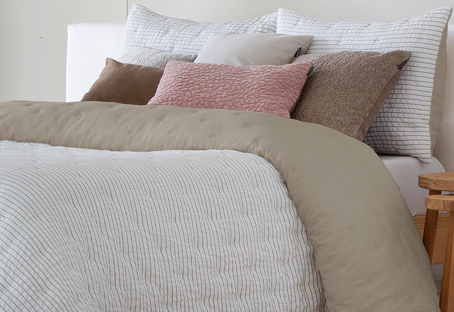 Bouti edredón comforter de entretiempo en tejido jacquard a rayas de la marca Fundeco by Antilo. Diseño elegante y sofisticado. Relleno tacto pluma. Modelo reversible con dos caras diferentes. Garantía de máxima calidad. Packaging en bolsa estilo maleta de pvc con cierre en cremallera y fotolito impreso. Tacto ultra suave - Soft touch