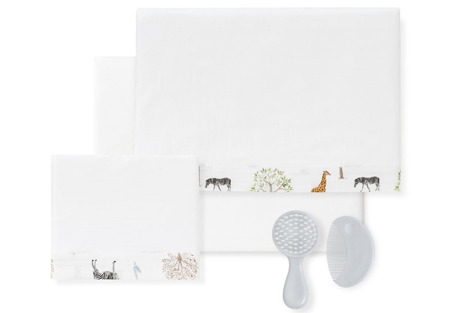 Sábana de bebé con aplicación estampada para cuna de la marca Don Algodon by Interbaby. Detalle de regalo de peine y cepillo.