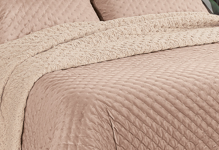 Edredón comforter modelo Porto con volante en la cara principal y sherpa borreguito a tono en el reverso de la marca Llarbona. Garantía de calidad / precio sin competencia. Edredón cálido con un tacto extra suave.