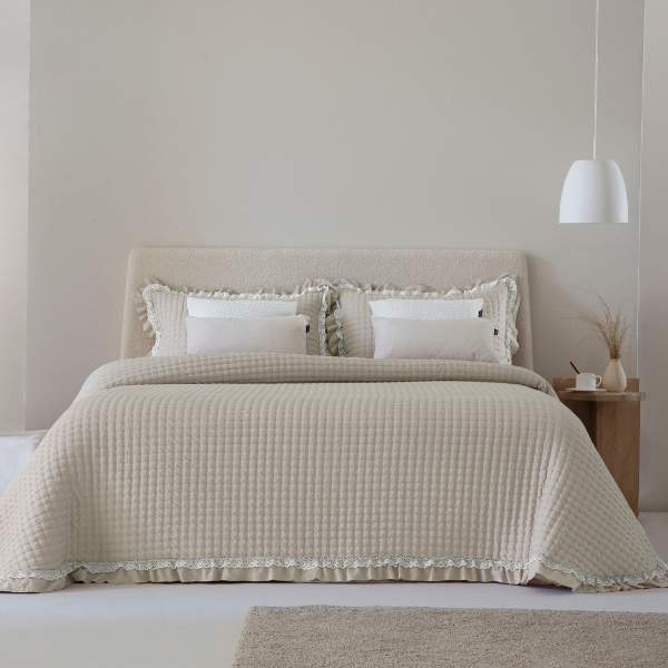 Colcha boutí beige modelo EVERLY de FUN DECO confeccionada en tejido de alta calidad con acolchado ligero y pespunteado regular, que aporta una textura suave y envolvente. Presenta un acabado especialmente cuidado, con volante fruncido en tono natural y un delicado encaje decorativo que recorre todo el borde, aportando un toque romántico y elegante. Su diseño combina sencillez y detalle, logrando una estética armoniosa y atemporal que viste la cama con calidez y estilo. Ideal para crear ambientes acogedores y luminosos, es perfecta para entretiempo y para quienes buscan un acabado refinado y femenino en el dormitorio.