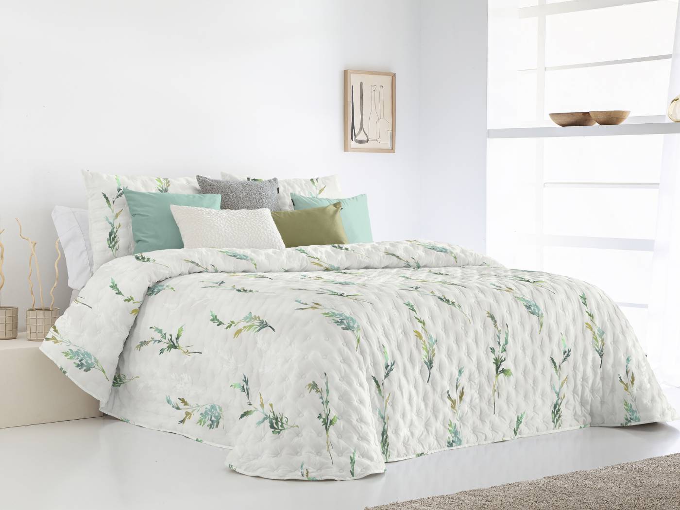 Renueva tu dormitorio con la Colcha Bouti SALOME de Fundeco, una pieza versátil que combina la elegancia de la naturaleza con la modernidad de la geometría. Gracias a su diseño reversible, esta colcha te permite disfrutar de dos ambientes totalmente distintos en una sola pieza