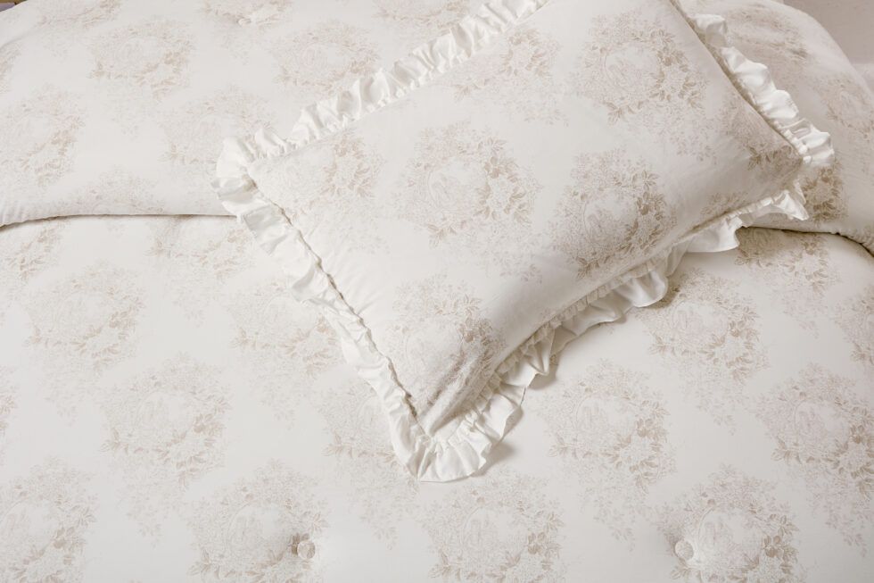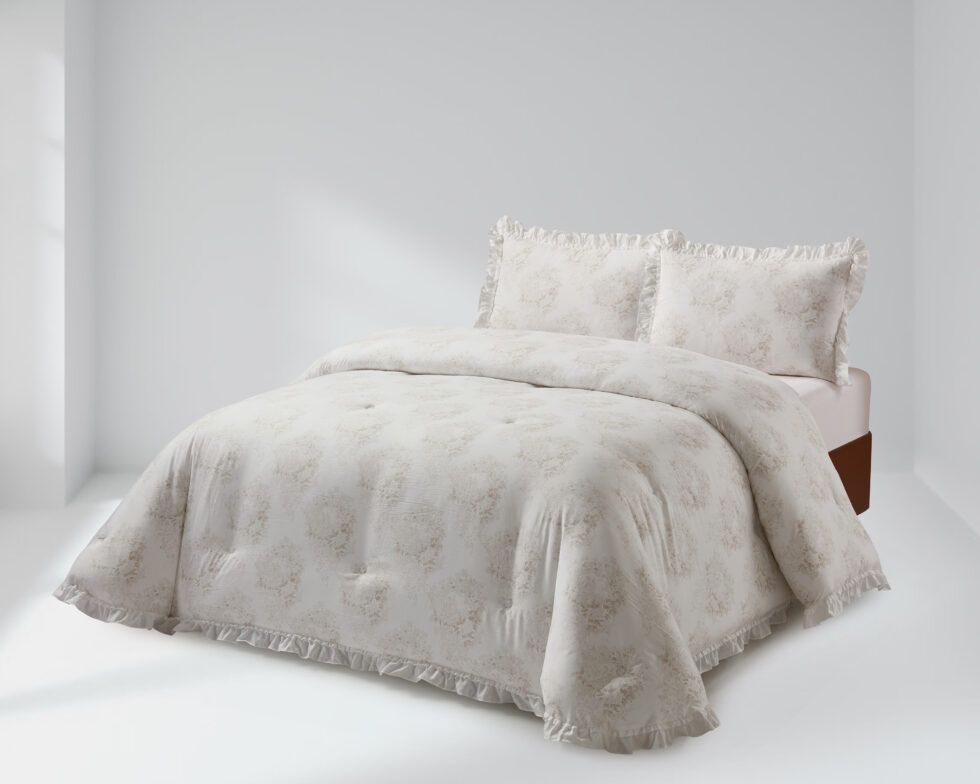 Colcha edredón con volantes modelo Avendal . El diseño incluye delicados motivos florales en colores suaves, distribuidos de manera uniforme por toda la superficie, lo que le da un aire sofisticado y atemporal. La colcha cuenta con un acabado de volantes en los bordes, detalle que añade un toque romántico y distintivo. Las fundas de almohada a juego repiten el mismo estampado y también llevan volantes, creando una composición armónica y cuidada que realza la estética del conjunto. Ideal para quienes buscan frescura y elegancia con un estilo tradicional. Ideal para el invierno.