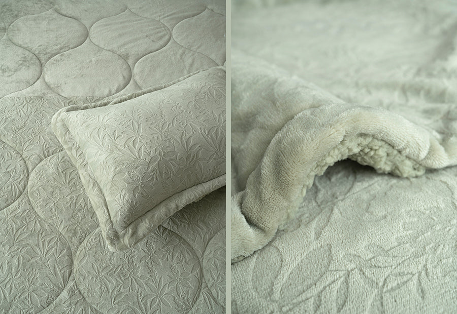 Edredón de invierno con sedalina cosida formando cuadros en color gris en la parte superior y sherpa a tono en el reverso de la marca Clara Vidal. Un edredón de alto poder calorífico. Tacto extra suave. Tres capas de abrigo contra el frío: una exterior de tejido sedalina en 300gr/m2, una segunda capa en el reverso en tejido borreguito sherpa en 180 gr/m2 y finalmente una tercera capa de abrigo interior con relleno de fibra hueca en 140 gr/m2.