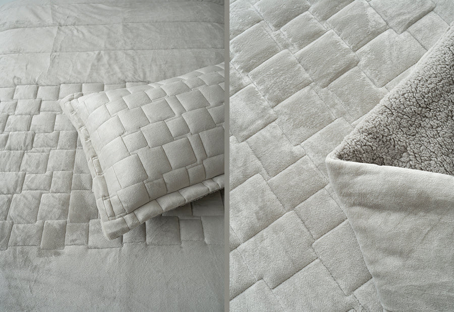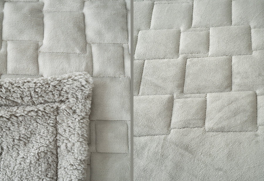 Edredón de invierno con sedalina cosida formando cuadros en color gris en la parte superior y sherpa a tono en el reverso de la marca Clara Vidal. Un edredón de alto poder calorífico. Tacto extra suave. Tres capas de abrigo contra el frío: una exterior de tejido sedalina en 300gr/m2, una segunda capa en el reverso en tejido borreguito sherpa en 180 gr/m2 y finalmente una tercera capa de abrigo interior con relleno de fibra hueca en 140 gr/m2.