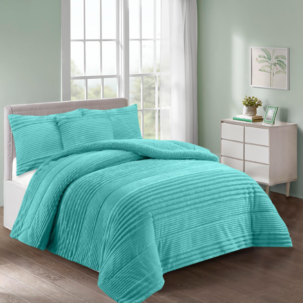 Edredón conforter color aguamarina con interior de sherpa de la firma Dmateo. Tiene un diseño sencillo en color lisos jugando con los anchos del surco, queda ideal puesto en cama.