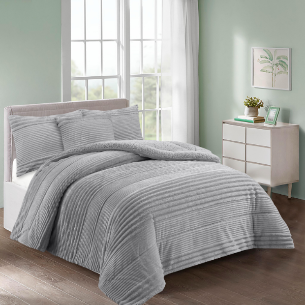 Edredón conforter color gris con interior de sherpa de la firma Dmateo. Tiene un diseño sencillo en color lisos jugando con los anchos del surco, queda ideal puesto en cama.