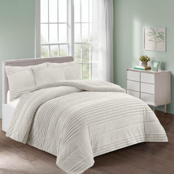 Edredón conforter color marfil con interior de sherpa de la firma Dmateo. Tiene un diseño sencillo en color lisos jugando con los anchos del surco, queda ideal puesto en cama.