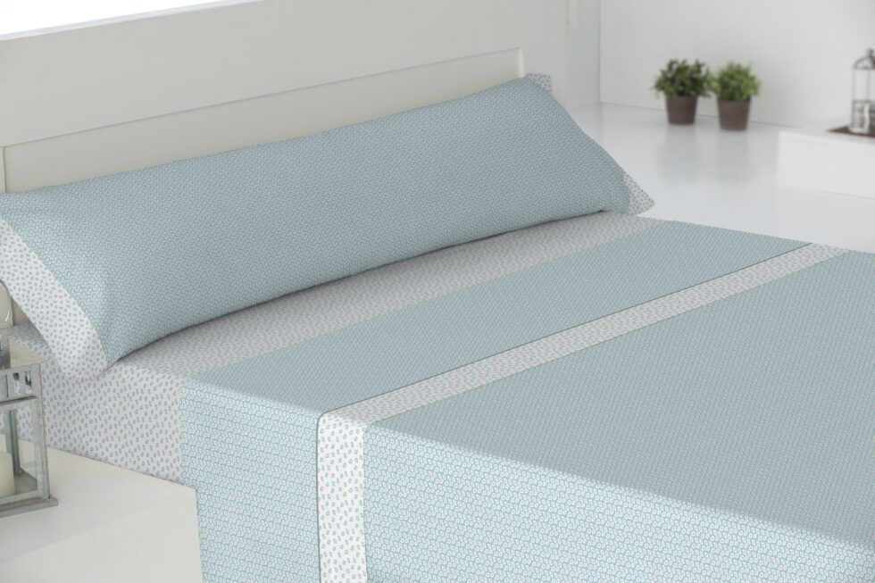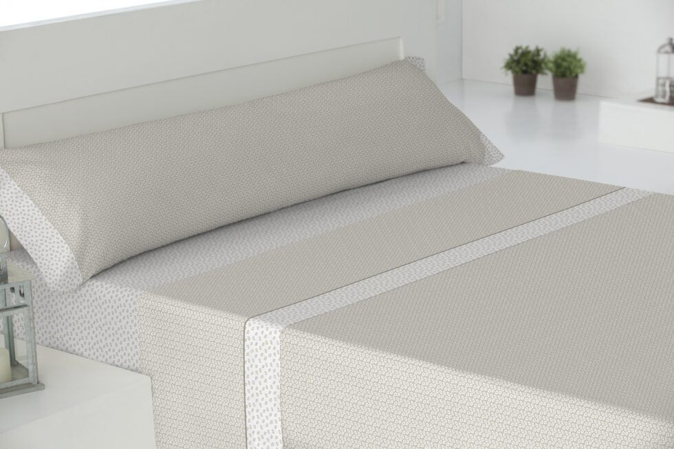 Dale un aire fresco y moderno a tu dormitorio con el juego de sábanas modelo Lavanda en color beige , gris y azul